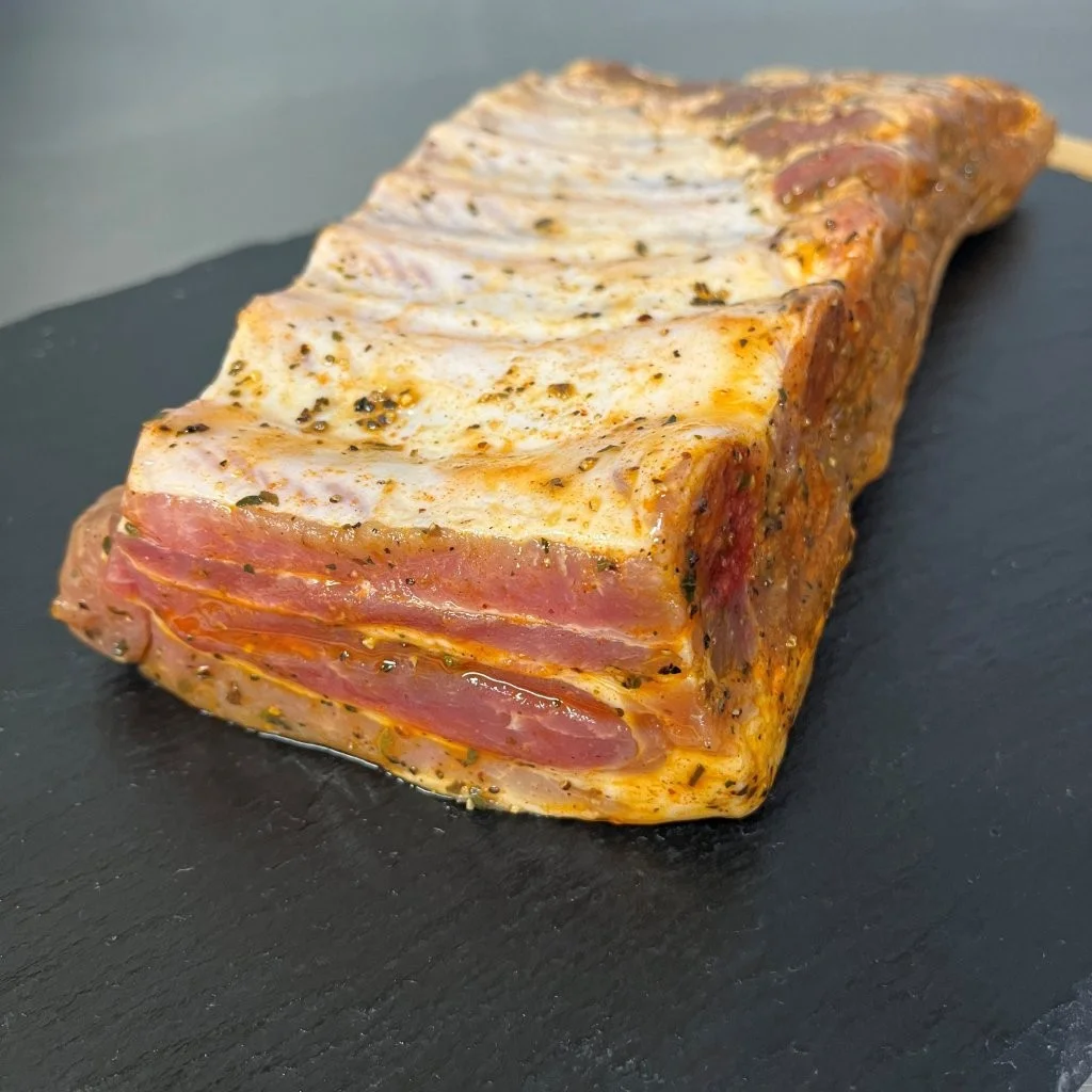Aukščiausia rūšis. Šonkaulius marinuojame su aliejumi, citrina, prieskoninėmis žolelėmis ir imbieru. Skaniausia ant laužo, bet puikiai tinka ir orkaitėje kepti.